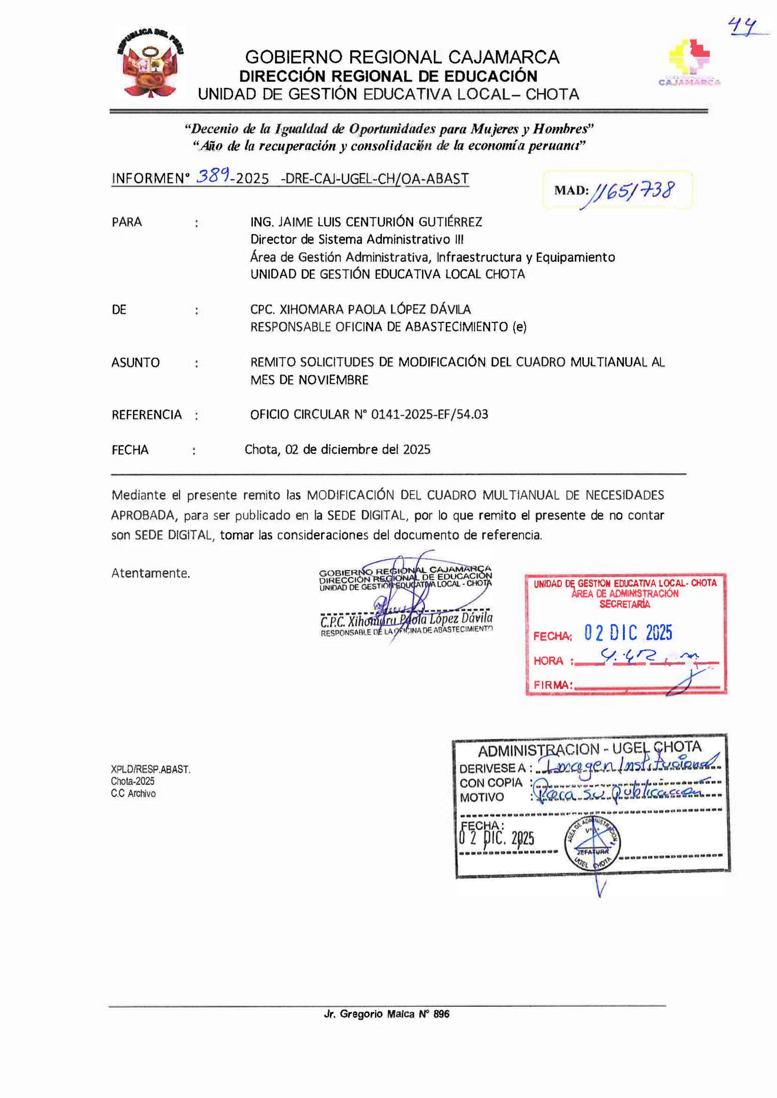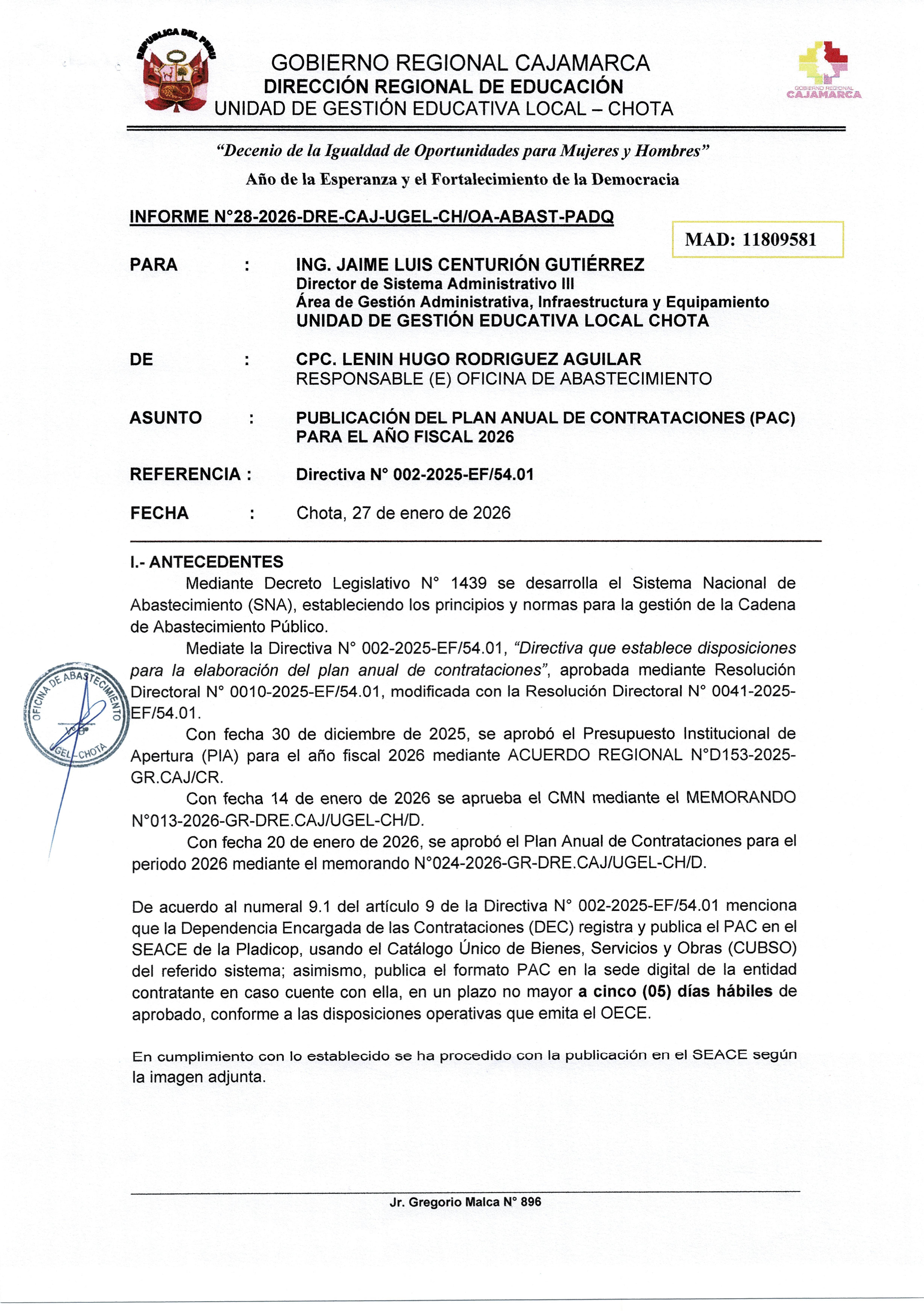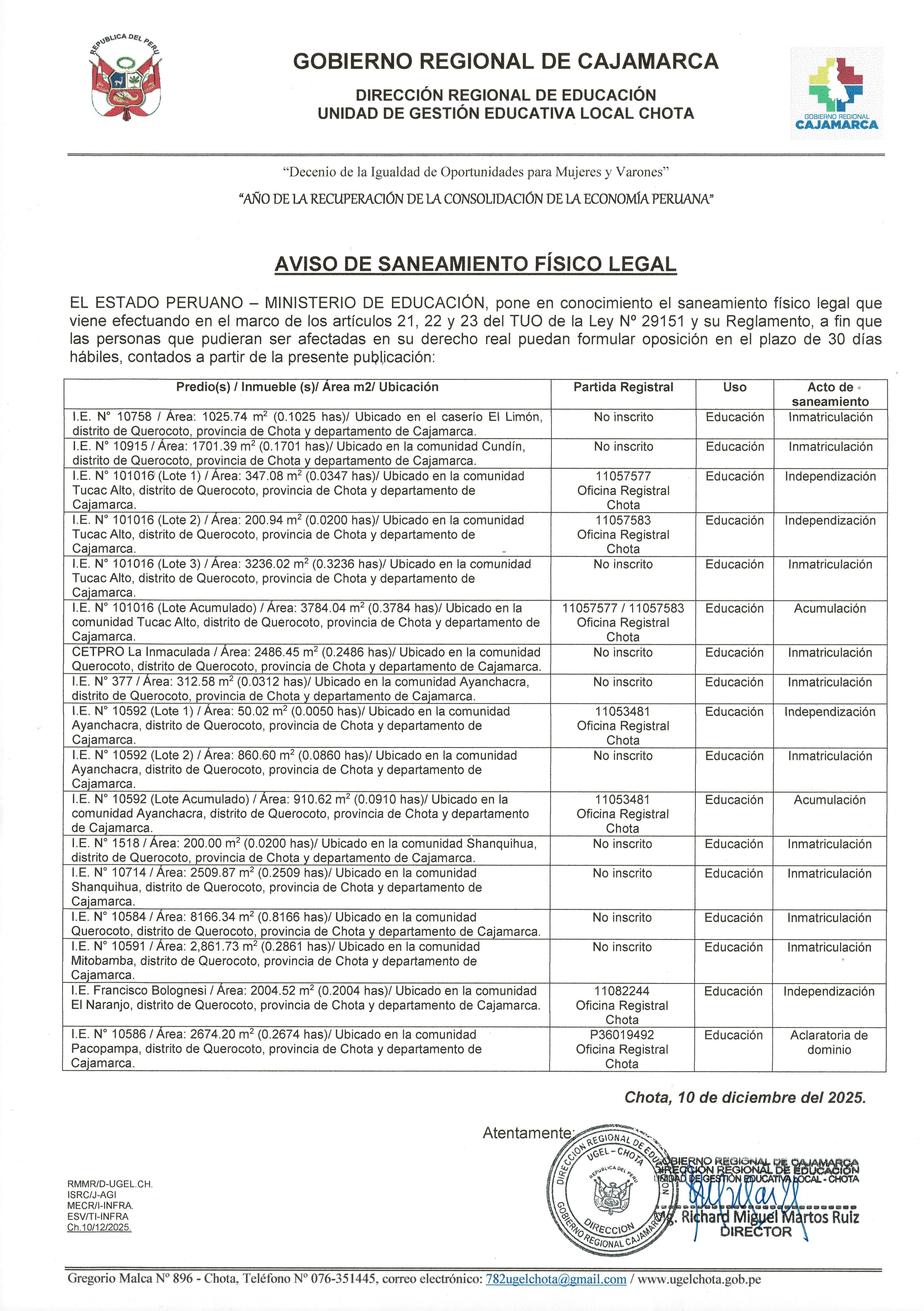 Se hace constar a todos los postulantes al PROCESO CAS Nº 015-2025-GR-DRE-CAJ/UGEL-CHOTA - CONTRATACIÓN DE PERSONAL PARA LA IMPLEMENTACION DE LAS INTERVENCIONES Y ACCIONES PEDAGÓGICAS DEL MINISTERIO DE EDUCACIÓN EN LOS GOBIERNOS REGIONALES, GOBIERNOS LOCALES Y LIMA METROPOLITANA EN EL AÑO FISCAL 2025 SEGÚN RESOLUCIÓN MINISTERIAL N° 003-2025-MINEDU, publicado el 19 de setiembre del año 2025 en el portal de SERVIR, página oficial de la Entidad y redes sociales de la UGEL Chota lo siguiente:
