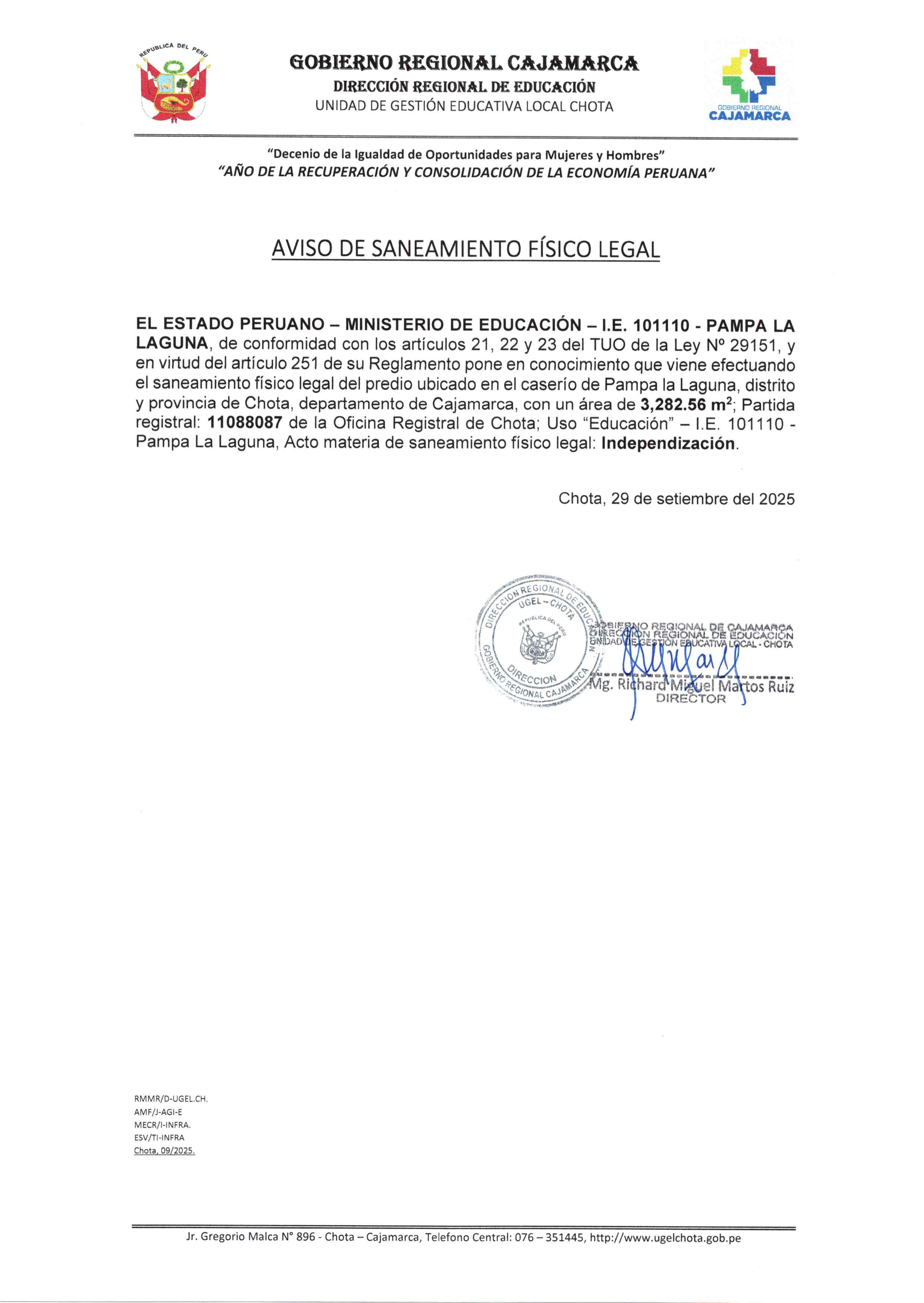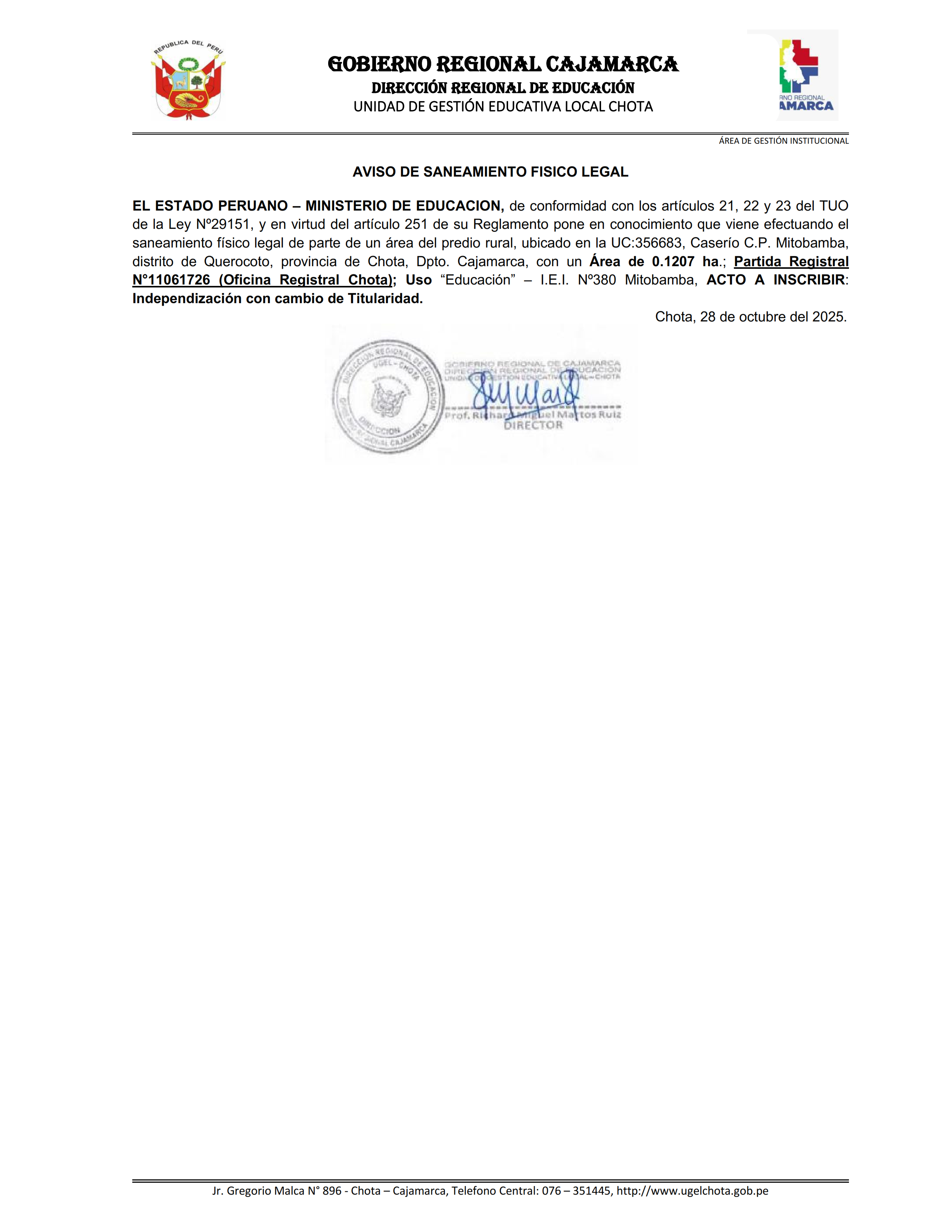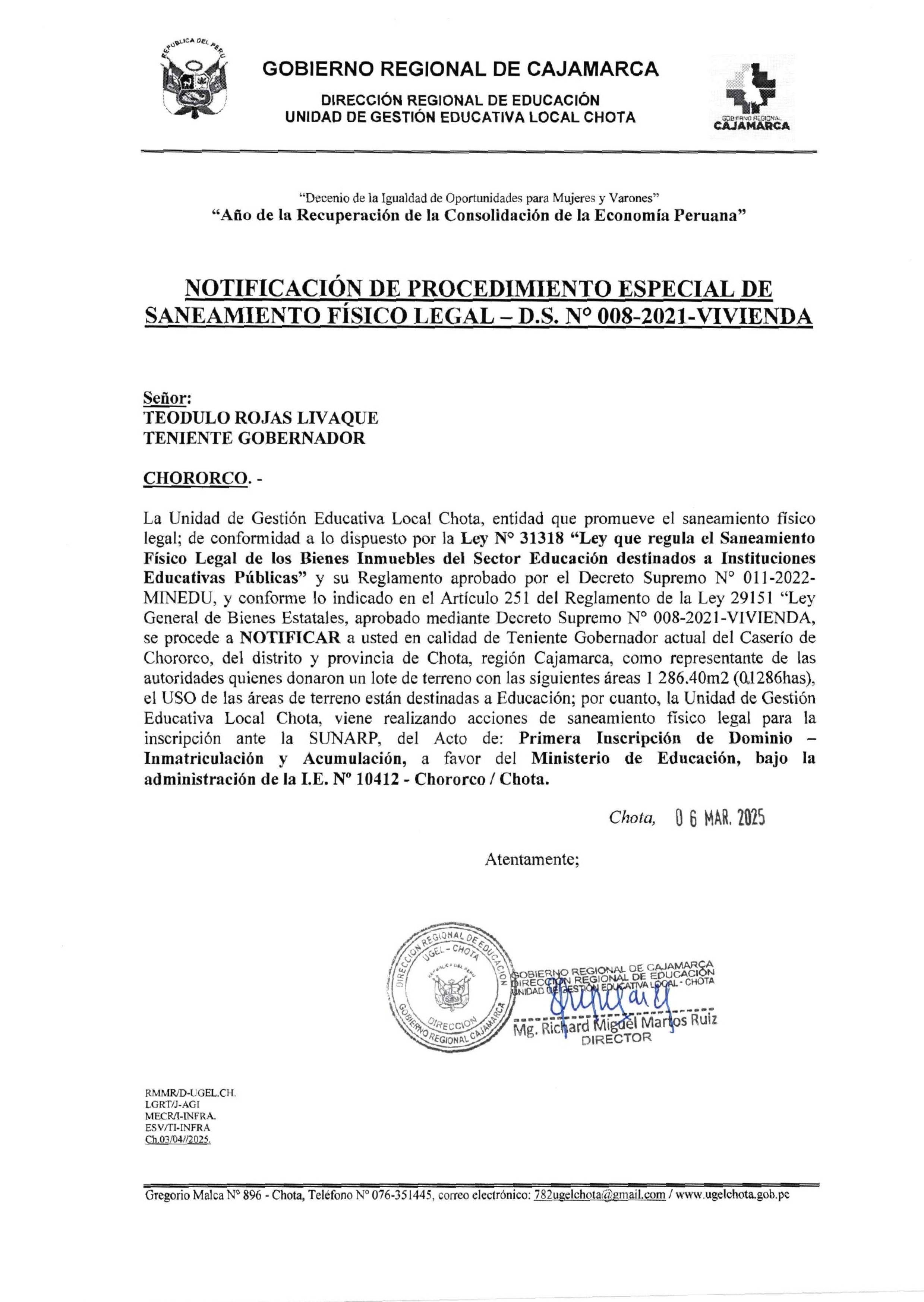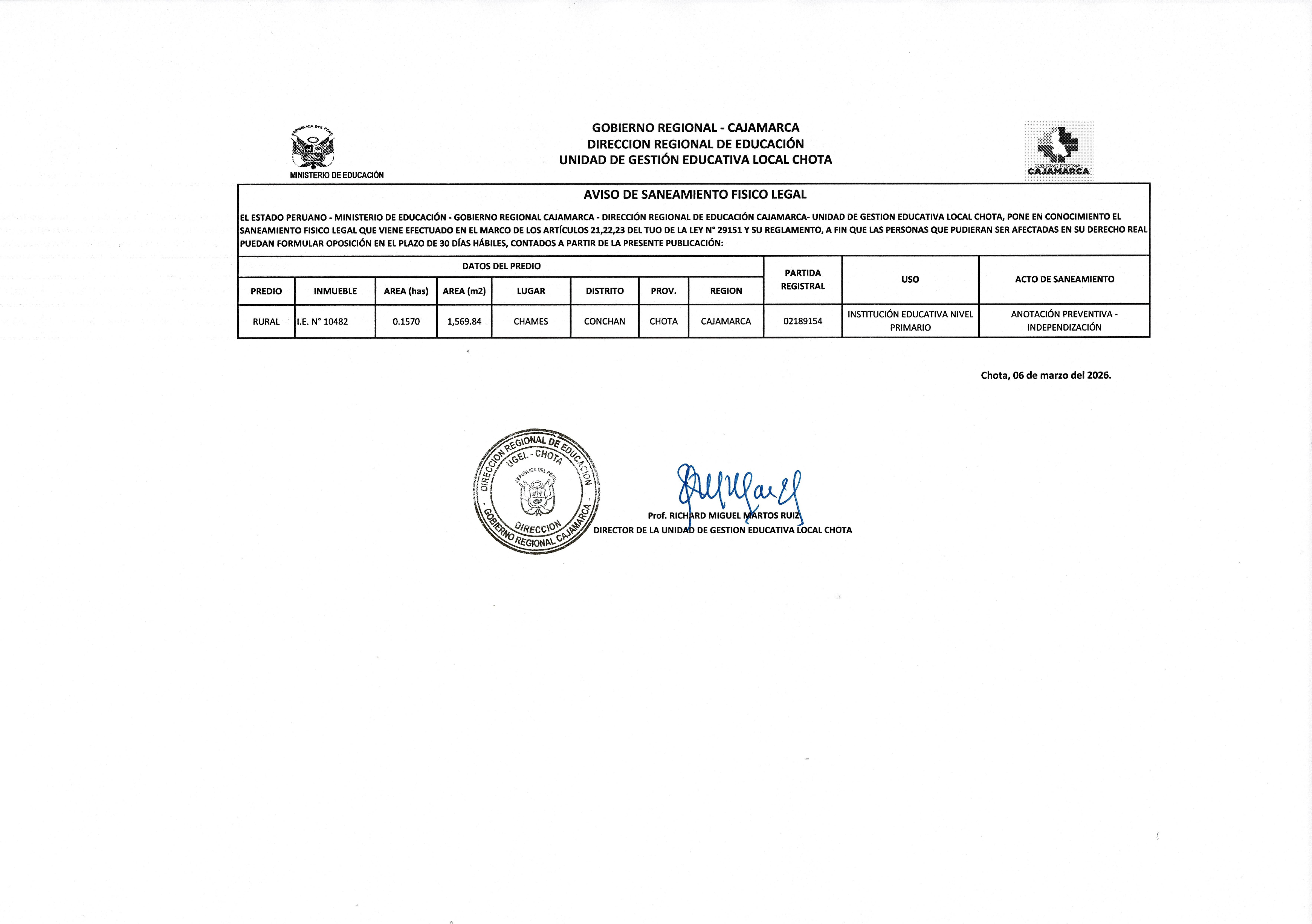 El Estado Peruano - Ministerio de Educación - Gobierno Regional Cajamarca - Dirección Regional de Educación Cajamarca- Unidad de Gestión Educativa Local Chota, pone en conocimiento el saneamiento físico legal que viene efectuando en el marco de los artículos 21,22,23 del TUO de la Ley N° 29151 y su Reglamento, a fin que las personas que pudieran ser afectadas en su derecho real puedan formular oposición en el plazo de 30 días hábiles, contados a partir de la presente publicación:
