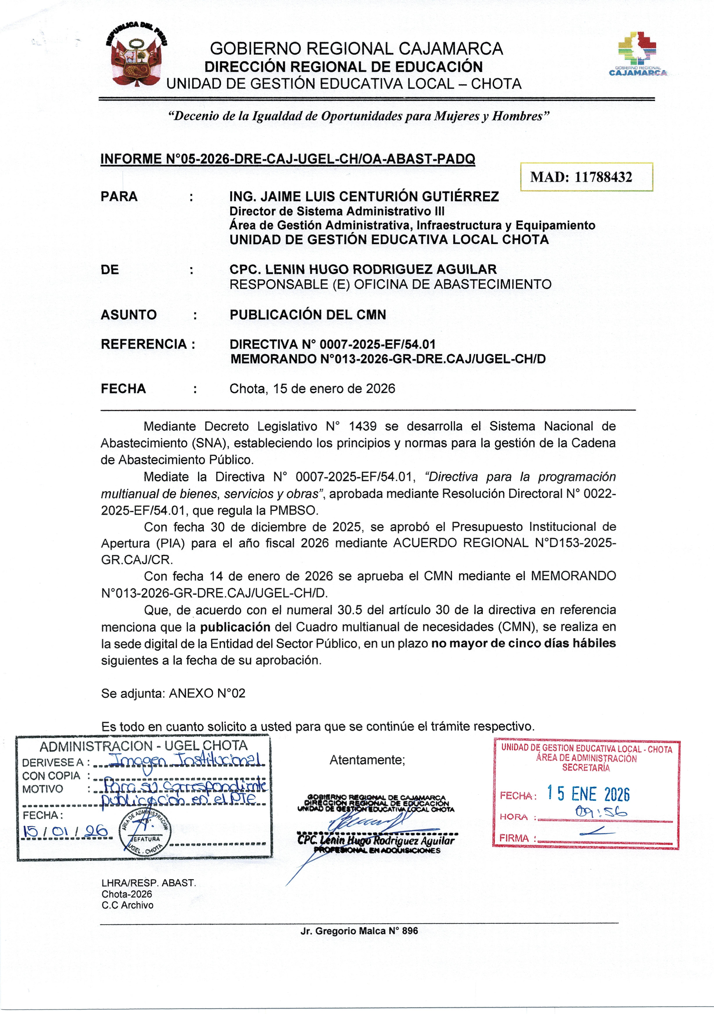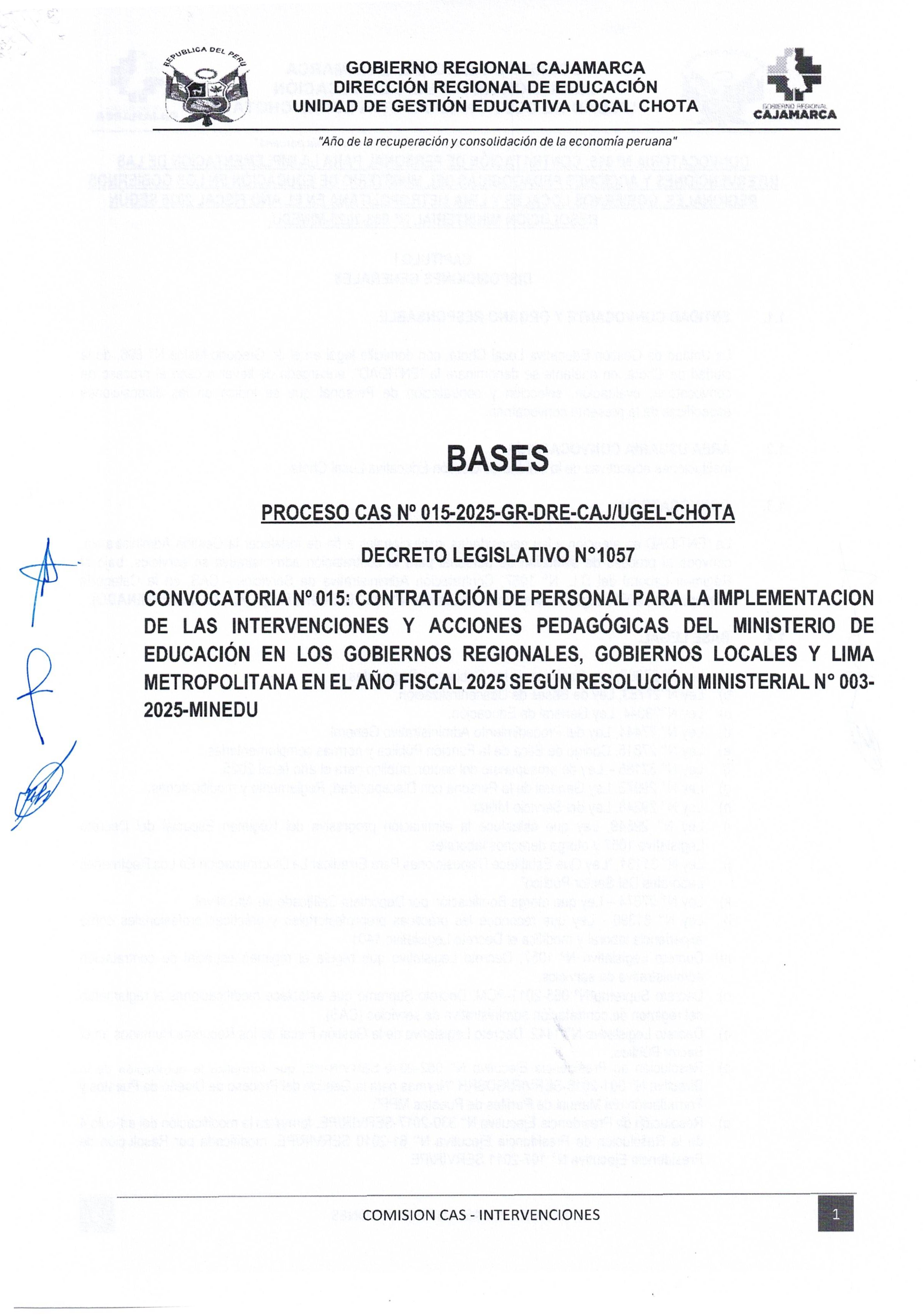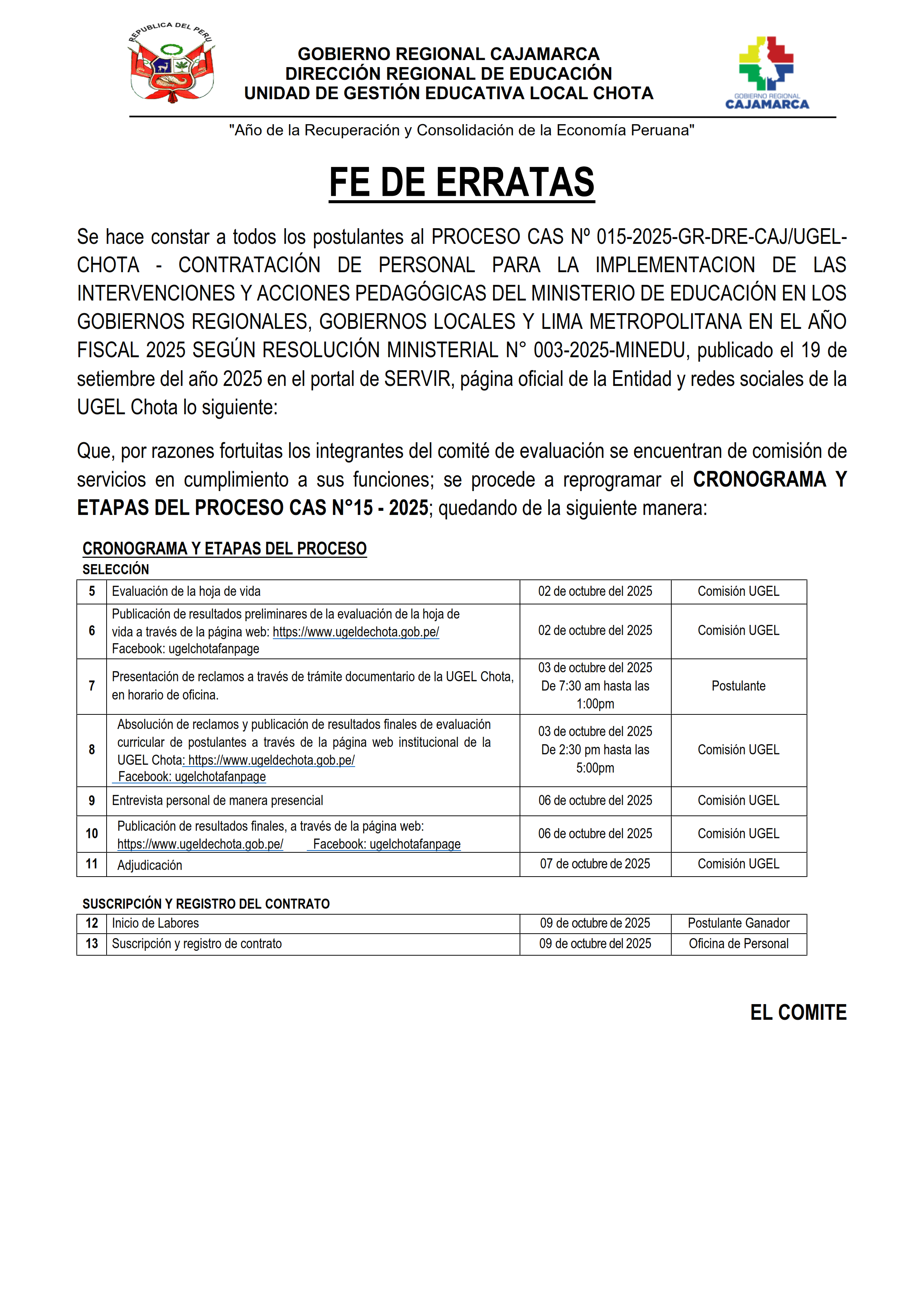 Se hace constar a todos los postulantes al PROCESO CAS Nº 015-2025-GR-DRE-CAJ/UGEL-CHOTA - CONTRATACIÓN DE PERSONAL PARA LA IMPLEMENTACION DE LAS INTERVENCIONES Y ACCIONES PEDAGÓGICAS DEL MINISTERIO DE EDUCACIÓN EN LOS GOBIERNOS REGIONALES, GOBIERNOS LOCALES Y LIMA METROPOLITANA EN EL AÑO FISCAL 2025 SEGÚN RESOLUCIÓN MINISTERIAL N° 003-2025-MINEDU, publicado el 19 de setiembre del año 2025 en el portal de SERVIR, página oficial de la Entidad y redes sociales de la UGEL Chota lo siguiente:
