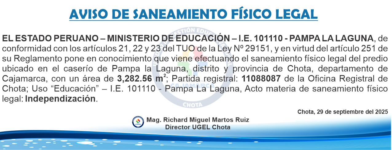 El MINISTERIO DE EDUCACIÓN - DIRECCIÓN REGIONAL DE EDUCACIÓN CAJAMARCA- UNIDAD DE GESTIÓN EDUCATIVA LOCAL CHOTA, PONE EN CONOCIMIENTO EL SANEAMIENTO FÍSICO LEGAL QUE VIENE EFECTUADO EN EL MARCO DE LOS ARTÍCULOS 21,22,23 DEL TUO DE LA LEY N° 29151 Y SU REGLAMENTO, A FIN QUE LAS PERSONAS QUE PUDIERAN SER AFECTADAS EN SU DERECHO REAL PUEDAN FORMULAR OPOSICIÓN EN EL PLAZO DE 30 DÍAS HÁBILES, CONTADOS A PARTIR DE LA PRESENTE PUBLICACIÓN: