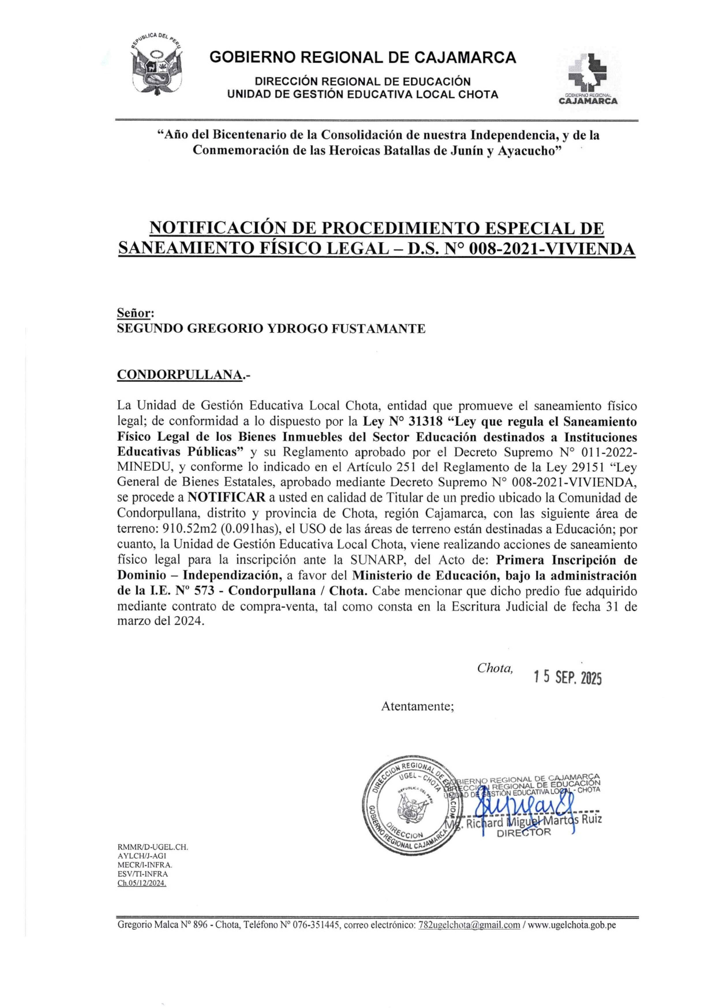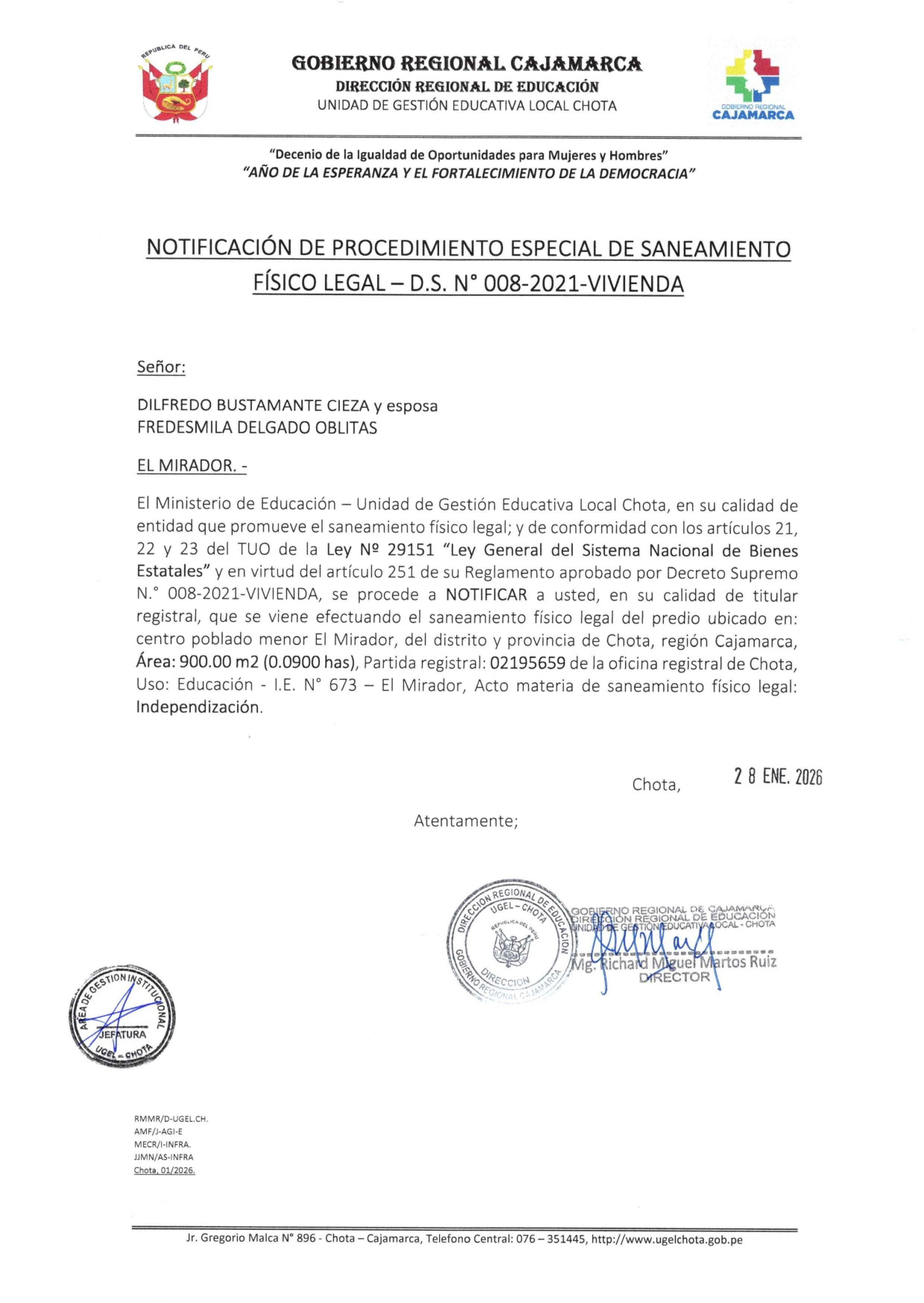 EL ESTADO PERUANO - MINISTERIO DE EDUCACIÓN - GOBIERNO REGIONAL CAJAMARCA - DIRECCIÓN REGIONAL DE EDUCACIÓN CAJAMARCA- UNIDAD DE GESTION EDUCATIVA LOCAL CHOTA, PONE EN CONOCIMIENTO EL SANEAMIENTO FISICO LEGAL QUE VIENE EFECTUADO EN EL MARCO DE LOS ARTÍCULOS 21,22,23 DEL TUO DE LA LEY N° 29151 Y SU REGLAMENTO, A FIN QUE LAS PERSONAS QUE PUDIERAN SER AFECTADAS EN SU DERECHO REAL PUEDAN FORMULAR OPOSICIÓN EN EL PLAZO DE 30 DÍAS HÁBILES, CONTADOS A PARTIR DE LA PRESENTE PUBLICACIÓN: