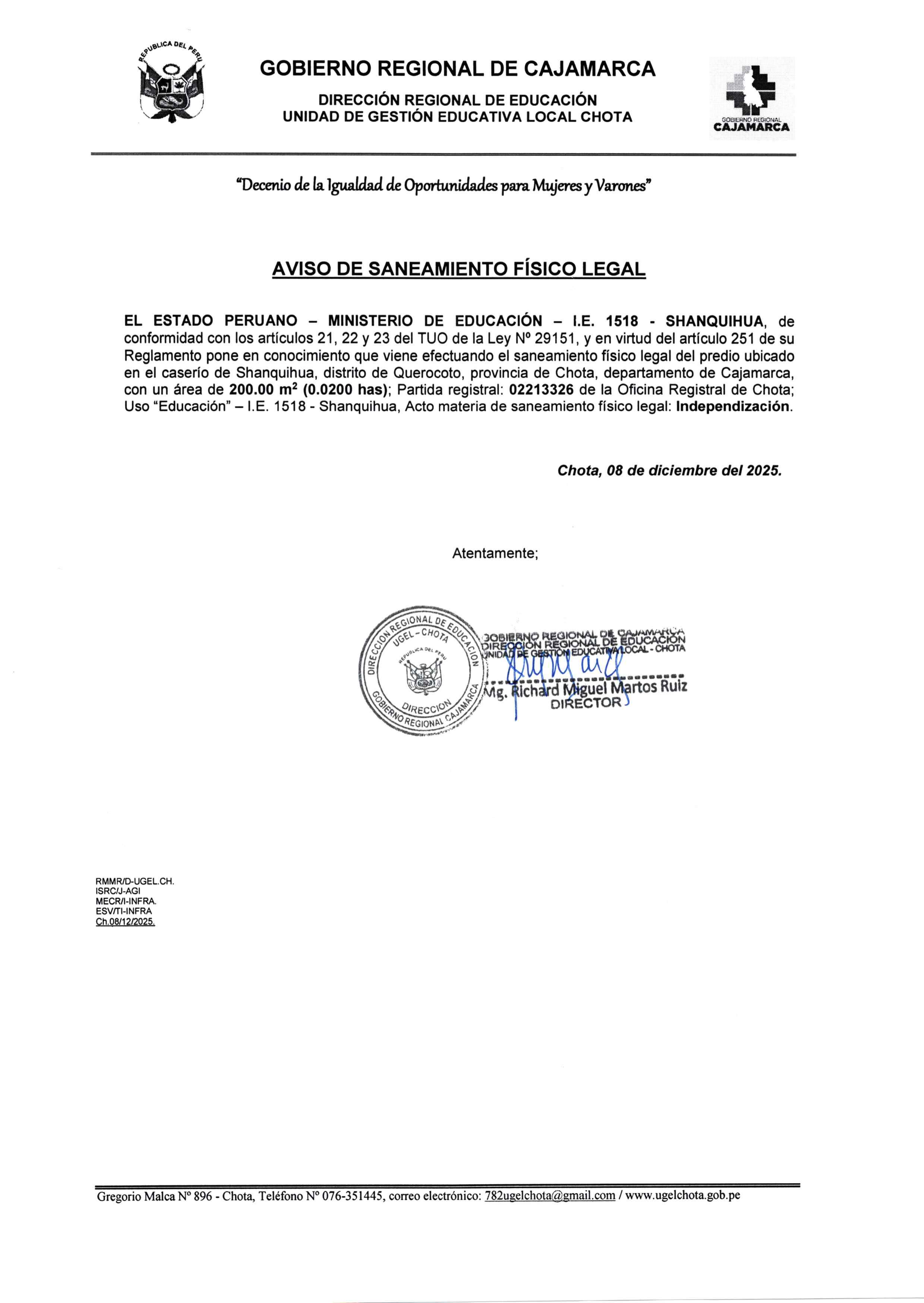 El Estado Peruano - Ministerio de Educación - Gobierno Regional Cajamarca - Dirección Regional de Educación Cajamarca- Unidad de Gestión Educativa Local Chota, pone en conocimiento el saneamiento físico legal que viene efectuando en el marco de los artículos 21,22,23 del TUO de la Ley N° 29151 y su Reglamento, a fin que las personas que pudieran ser afectadas en su derecho real puedan formular oposición en el plazo de 30 días hábiles, contados a partir de la presente publicación: